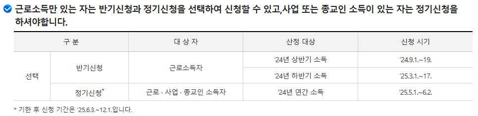 - 반기 신청은 근로 소득자에 한해 진행되고 있습니다. 사업 소득이 있는 사업자의 경우에는 5월에 진행되는 정기 신청을 해야합니다.